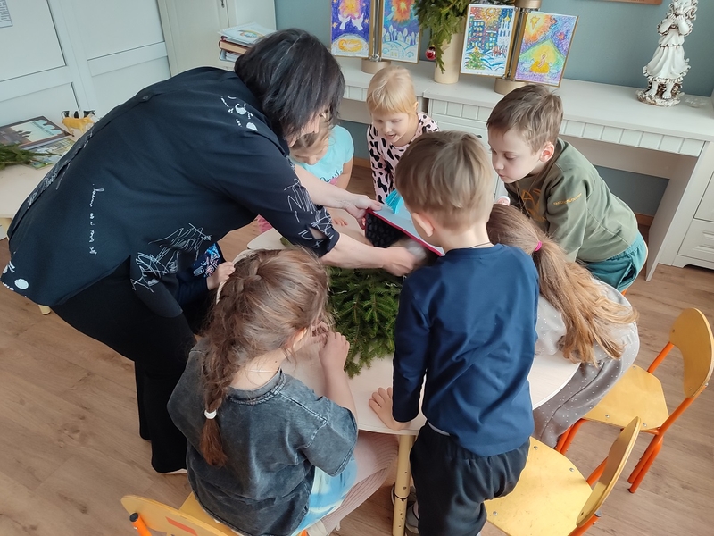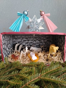 Рождество Христово, Ангел прилетел,Он летел по небу, людям песню пел.Воспитанники старших и подготовительных групп изготовили инсталляцию «Рождество Христово». Дети использовали различные изобразительные средства и техники.