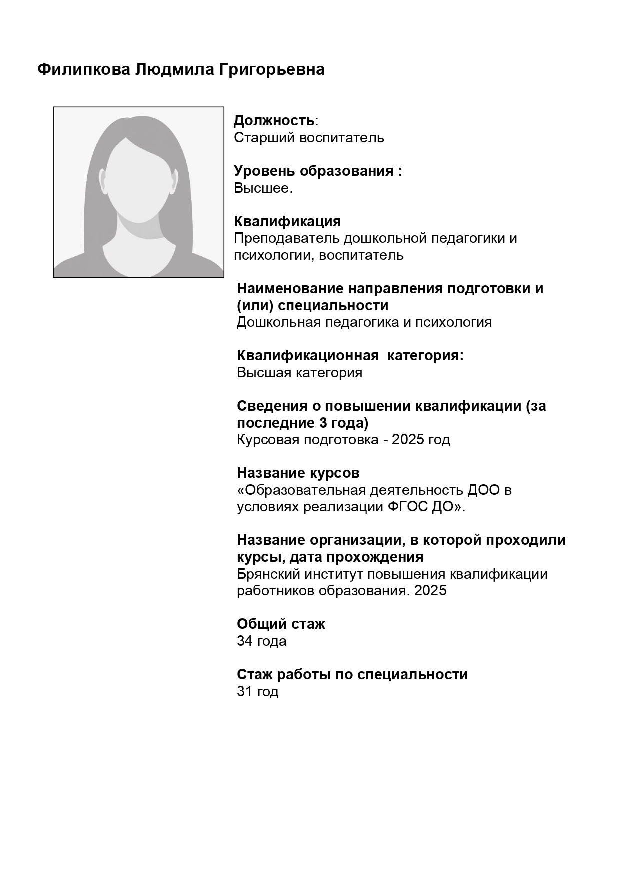 Филипкова Людмила Григорьевна (старший воспитатель)
