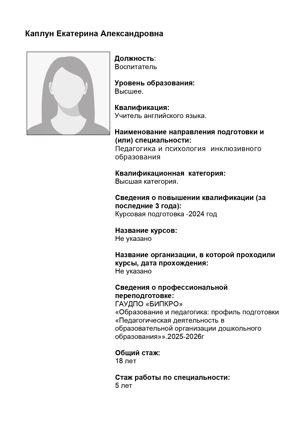 Каплун Екатерина Александровна (педагого дополнительного образования)