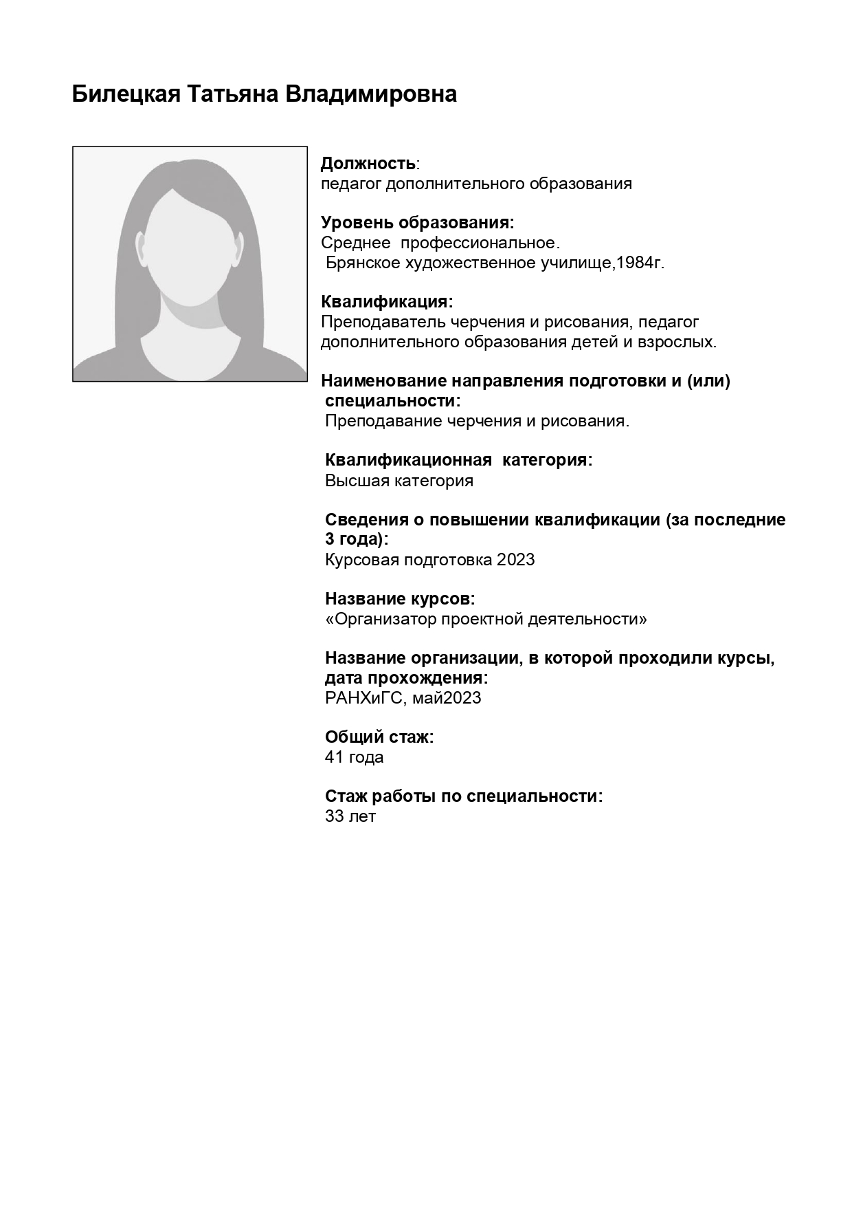 Билецкая Татьяна Владимировна (педагог дополнительного образования)