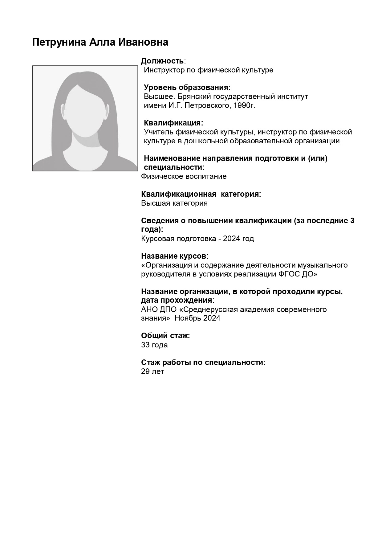 Петрунина Алла Ивановна (инструктор по физической культуре)